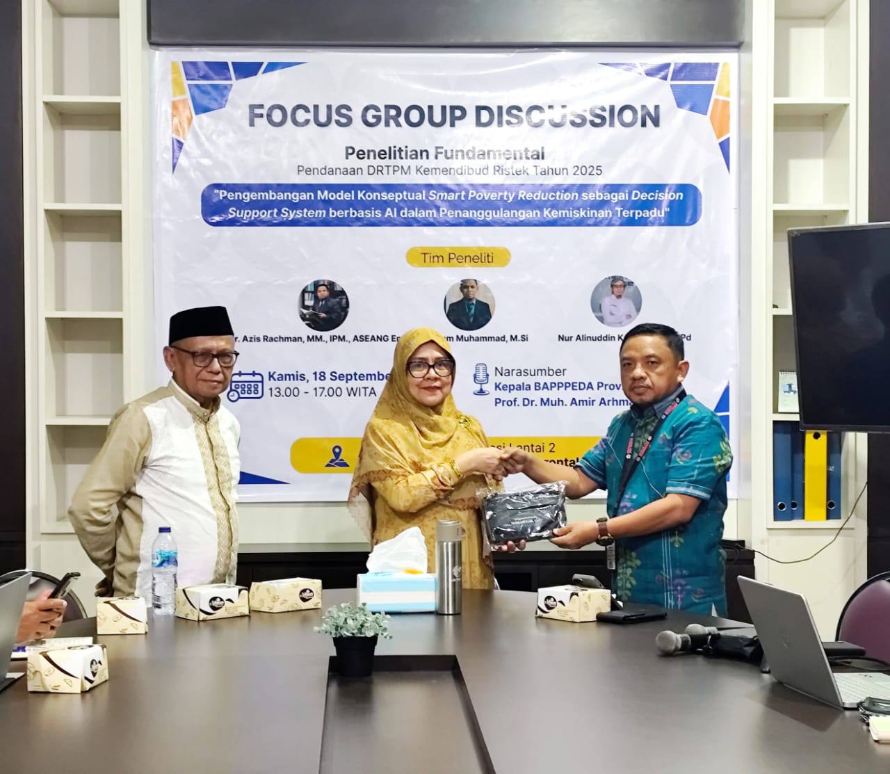 Tim Peneliti terdiri dari Dr. Ikram Muhammad, M.Si., Dr. Azis Rachman, MM., dan Nur Alinuddin Kaharu, M.Pd., dengan judul penelitian “Pengembangan Model Konseptual Smart Poverty Reduction sebagai Decision Support System Berbasis AI dalam Penanggulangan Kemiskinan Terpadu”. Penelitian ini dibiayai oleh DRTPM Kemendikbudristek RI Tahun 2025.