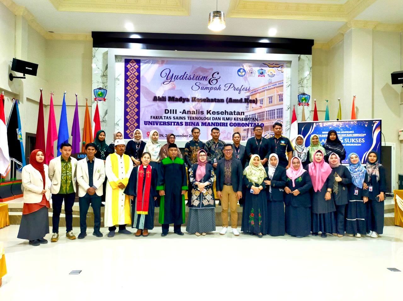 Gorontalo — Pelaksanaan Yudisium Gelombang II dan Sumpah Profesi Program Studi (Prodi) D3 Analis Kesehatan, Fakultas Sains Teknologi dan Ilmu Kesehatan (FSTIK) Universitas Bina Mandiri (UBM) Gorontalo berlangsung sukses pada Kamis (20/11/2025) di Aztin Convention Center Kampus UBM.